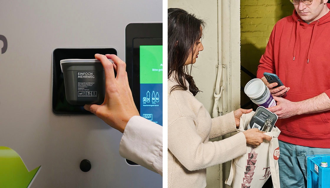 EINFACH MEHRWEG TO-GO Verpackungen liefern Lebensmittelgenuss und eine alltagstaugliche Rückführung für Nutzer: innen an bisher 6.000 EINFACH MEHRWEG Rückgabepunkten und über bestehende Pfandautomaten.